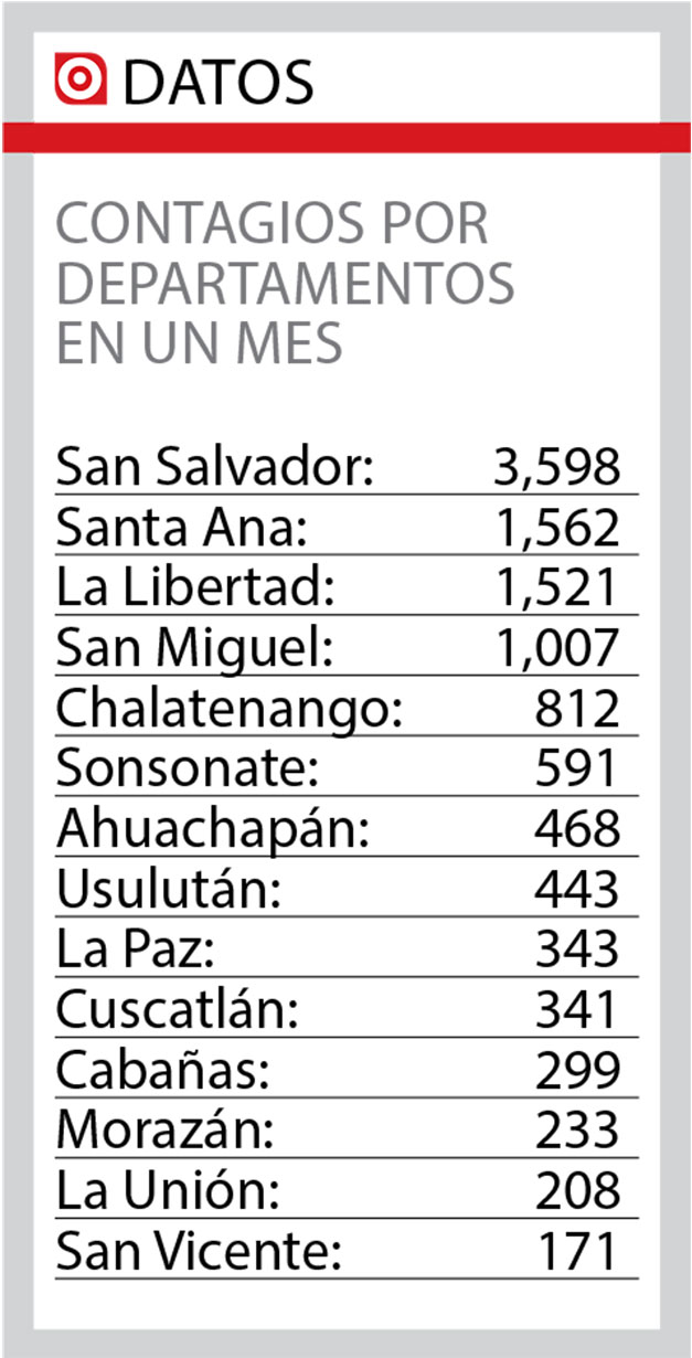 La información proporcionada en ese periodo por la página oficial del covid-19 en el país, refleja 11,268 contagios, de los cuales 4,970 pertenecen a estos ocho municipios, un 43 % de todos los casos. San Salvador se posiciona como el municipio que más personas positivas desde el 1 de septiembre con 1,237 enfermos, un promedio de 34 enfermos detectados cada día; a este le sigue Santa Ana con 1,078 contagios en los últimos 36 días, y San Miguel con 680 enfermos de covid-19 en dicho periodo.