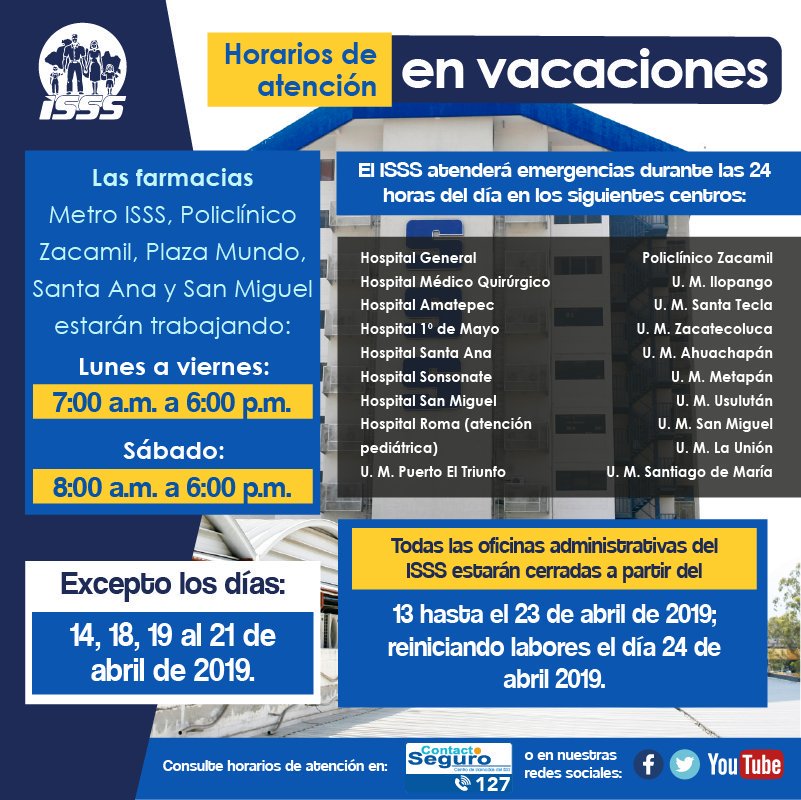 El Instituto Salvadoreño del Seguro Social (ISSS), informó esta mañana, sobre los horarios de atención durante la Semana Santa.