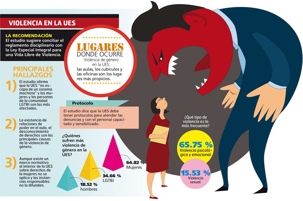 De acuerdo al informe, ocho de 10 estudiantes no conocen la de normativas que regulen “actos de violencia”, el 65 % de alumnos de la UES tampoco conocen instancias encargadas de aplicar las normativas y cerca 80 % cree que no aplican el reglamento disciplinario relacionado a la violencia de género en la universidad.