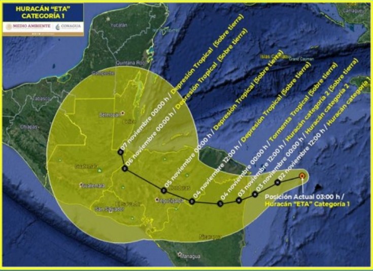 Trayectoria de Eta elaborada por el Servicio de Meteorología de México. Anticipa que tras tocar tierra como huracán categoría dos se convertirá en depresión tropical y dejará lluvias principalmente en el Triángulo Norte de Centroamérica (Guatemala, Honduras y El Salvador) desde el 4 hasta el 7 de noviembre.