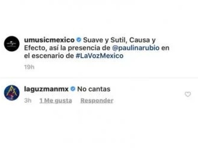 “La Guzmán” no pudo contener sus opiniones y comentó en una de las imágenes un comentario que dejó claro lo que piensa del talento de Paulina: “no cantas”, escribió. Ese comentario no agradó en lo más mínimo a los fans de Rubio, quienes reaccionaron de manera inmediata.