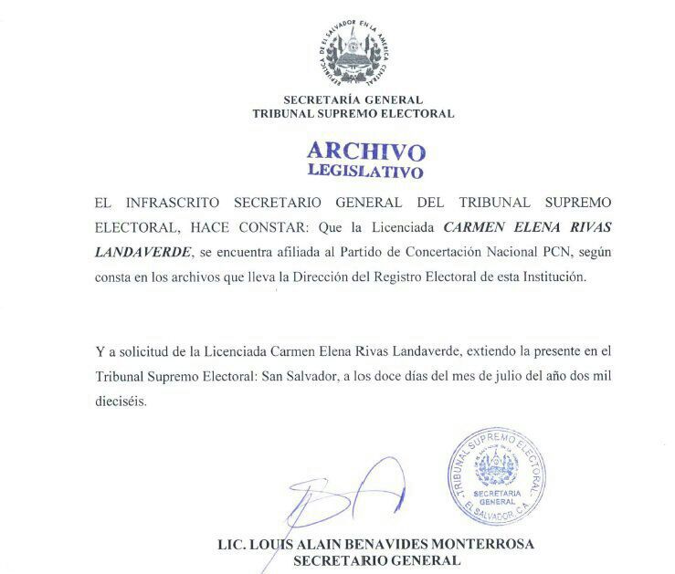Tanto los diputados como ella reconocieron que perteneció al Partido Conciliación Nacional (PCN), del cual fue candidata a diputada propietaria por el departamento de Chalatenango en el año 2006.