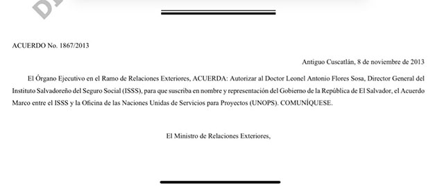 “El ministerio de relaciones exteriores de la República de El Salvador, mediante acuerdo No. 1867/2013 del 8 de noviembre de 2013 le da plenos poderes al Director General del ISSS para firmar dicho acuerdo general”, detalla Flores a través de un comunicado.