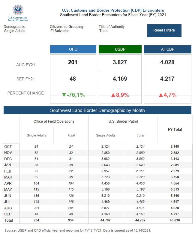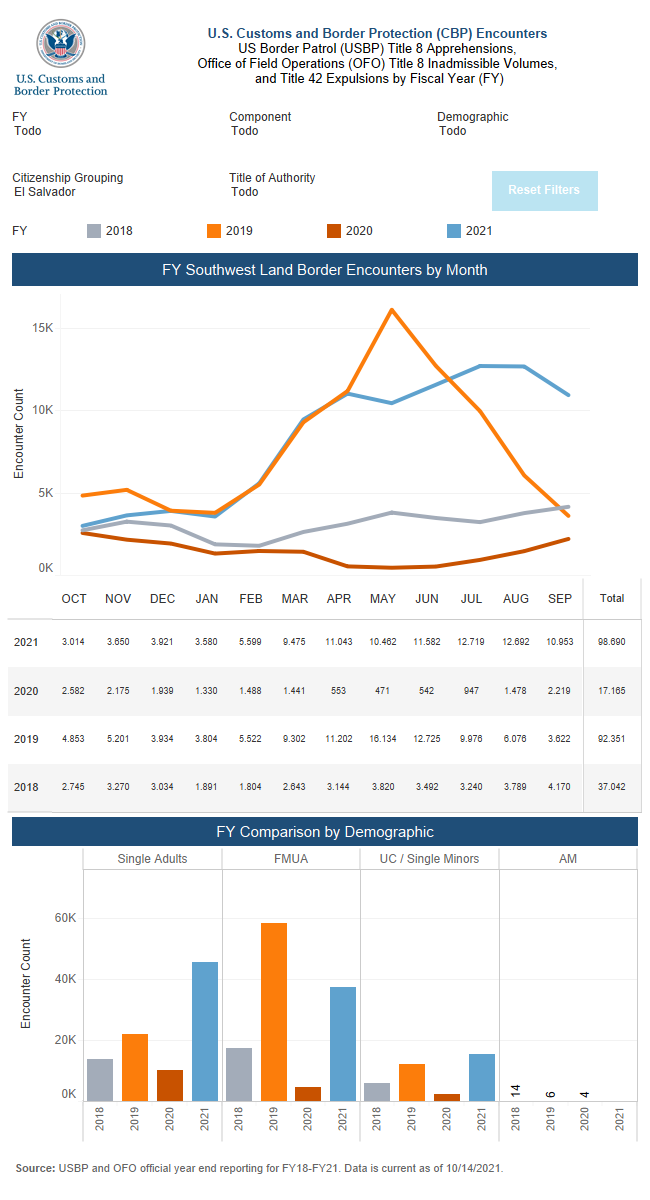 En 2020 durante el periodo más duro de la pandemia del covid-19 17,165 salvadoreños cruzaron ilegalmente la frontera sur de EEUU sin embargo en 2021 la cifra se multiplicó por cinco y al cierre de septiembre 98,690 salvadoreños arribaron en busca del sueño americano.El mismo fenómeno ocurrió con la llegada de migrantes salvadoreños solteros que fueron interceptados por las autoridades fronterizas, en 2020 fueron 10,209; pero en 2021 fueron detenidos 45,636.