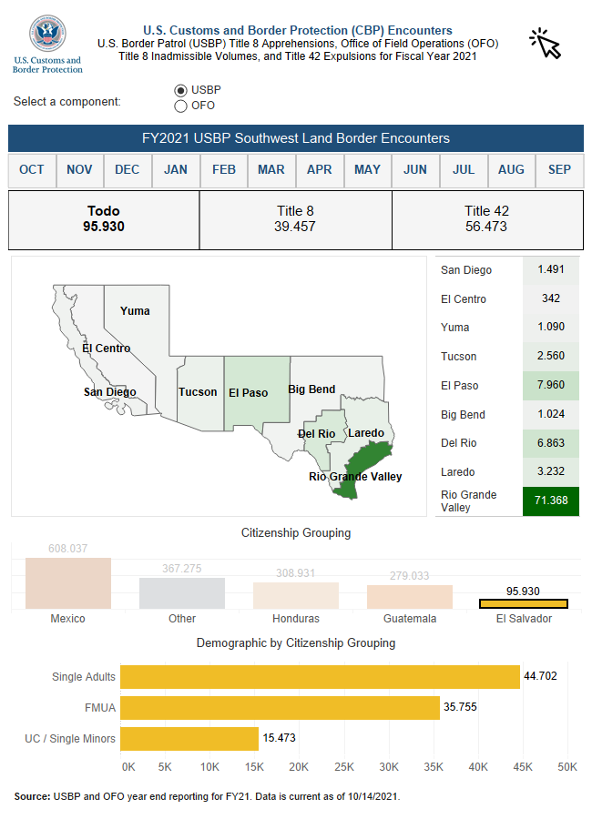 Las autoridades fronterizas de EEUU concluyeron el viernes los reportes del cierre del año fiscal 2021 con 1.734,686 detenciones de migrantes, números que jamás se habían registrado en los últimos 20 años. De esta significativa cifra 98,690 son salvadoreños, la quinta población con mayor reporte de desplazamientos en la región.