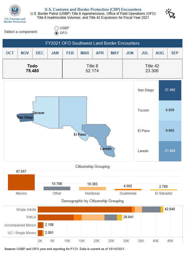 Las familias enteras que decidieron migran desde El Salvador también superaron a las cifras registradas en el año anterior cuando 4,579 Unidades Familiares fueron reportadas por las oficinas de Control de Aduanas y Protección de Fronteras (USBP) y la de de Operaciones de Campo (OFO), este año ambas oficinas informaron de la detención de 37,490 familias en 2021.