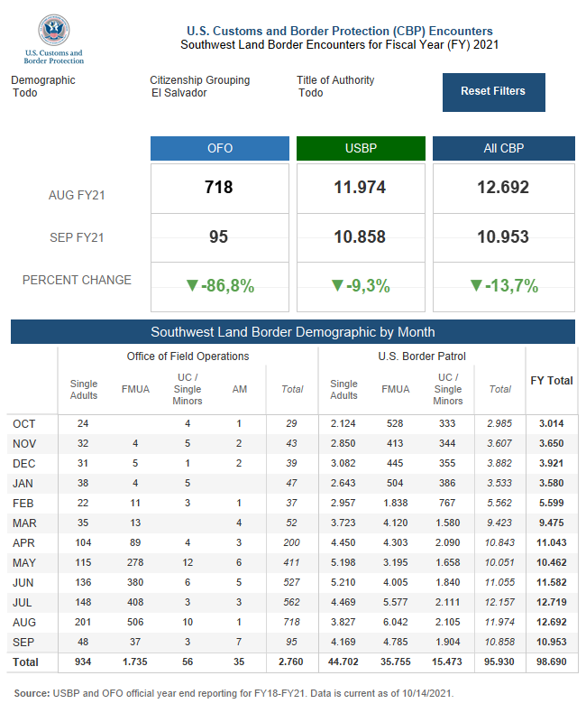 De ese consolidado de cerca de 200,000 migrantes arrestados en septiembre, 10,953 son originarios de El Salvador, cuya cifra descendió levemente comparadas con las llegadas de agosto (12,692) y julio (12,719), cuando se registraron los ingresos ilegales más numerosos de salvadoreños principalmente en el sur de Texas.