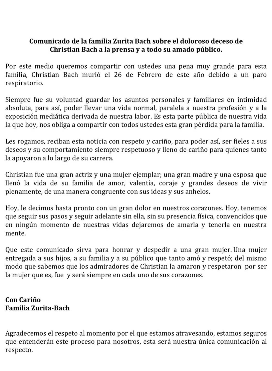 "Por este medio queremos compartir con ustedes una pena muy grande para esta familia. Christian Bach murió el 26 de febrero de este año debido a un paro respiratorio”, se lee al inicio del comunicado.