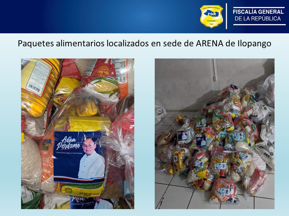 Según la corporación policial, tres mujeres estaban al interior de la sede del partido “trasegando el producto de las bolsas de los paquetes alimentarios”. Las fotografías compartidas esta mañana por la FGR muestran paquetes alimentarios con logo de la alcaldía municipal e Ilopango.