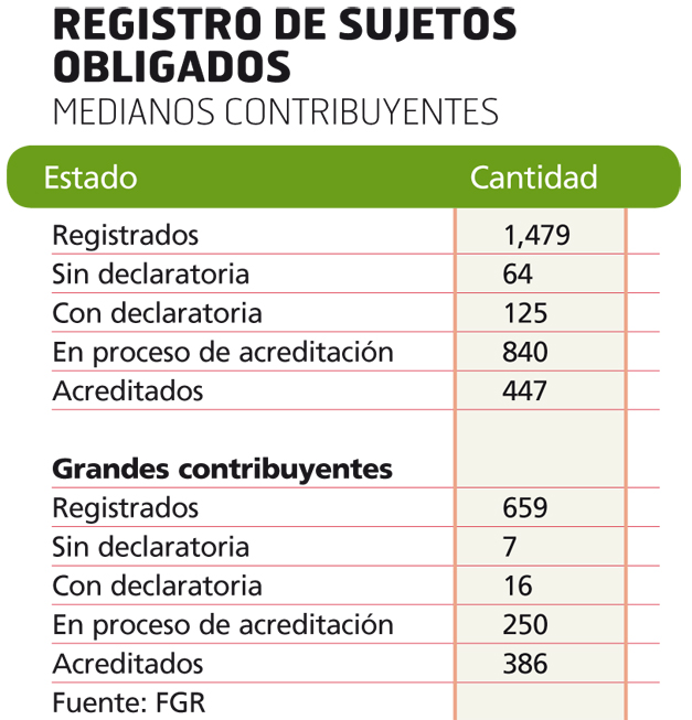 La FGR explicó que hay contribuyentes que no completaron el proceso al término del plazo determinado pero sus representantes legales solicitaron prórrogas. Para ellos, la UIF habilitó un sistema de registro. De esos, la institución reportó 20 sujetos considerados como grandes contribuyentes, de los cuales tres recibieron la acreditación. También, se registraron 26 medianos contribuyentes, pero la institución solo reportó a cinco con registro.