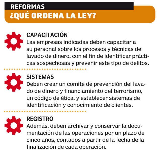Las reformas a la ley de lavado de dinero obligaron a la Unidad de Investigaciones Financieras (UIF) a elaborar un instructivo para aplicar las nuevas disposiciones. Este documento indica que las personas naturales y jurídicas que se desempeñan en 11 sectores productivos deben acreditarse en dicha unidad para poder realizar operaciones financieras. Quienes fallen con este requisito, según la ley, pierden acceso a los servicios financieros.