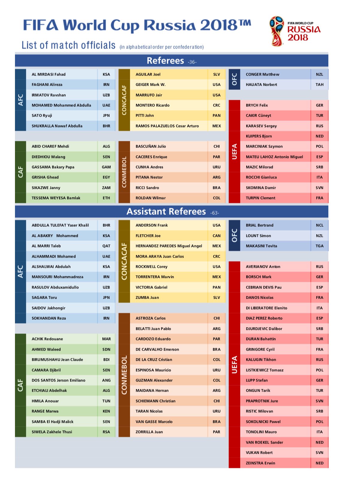 De acuerdo con la FIFA “la selección de la lista definitiva de colegiados se basó en la personalidad y las cualidades de cada árbitro, en su nivel de conocimientos de fútbol y su capacidad para leer los partidos y entender las distintas tácticas desplegadas por los equipos”.