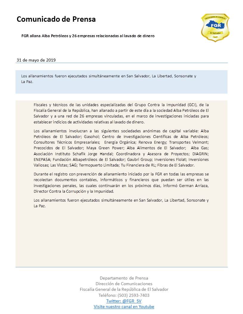 Agentes de la Fiscalía General de la República (FGR) y de la Policía Nacional Civil (PNC) iniciaron este viernes el allanamiento de las oficinas centrales de Alba Petróleos en Antiguo Cuscatlán y de 25 subsidiarias localizado en san Salvador, La Libertad, Sonsonete y La Paz, como parte de una investigación de lavado de dinero.