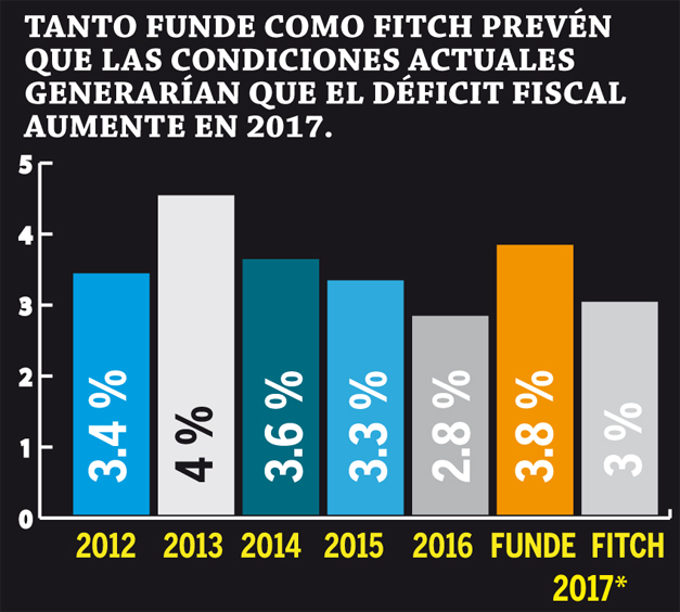 La agencia Fitch prevé que el déficit fiscal se incremente a 3 % del PIB, en 2016 este indicador cerró en 2.8 % del PIB.