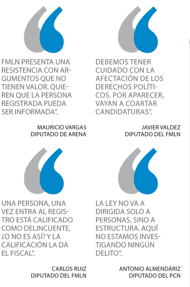 El diputado Javier Valdez, del FMLN, expresó que es necesario “tener cuidado con la afectación de los derechos políticos”. “Porque, por aparecer en este registro, vayan a coartar candidaturas, no podemos hacerle eso a la población salvadoreña”, expresó.