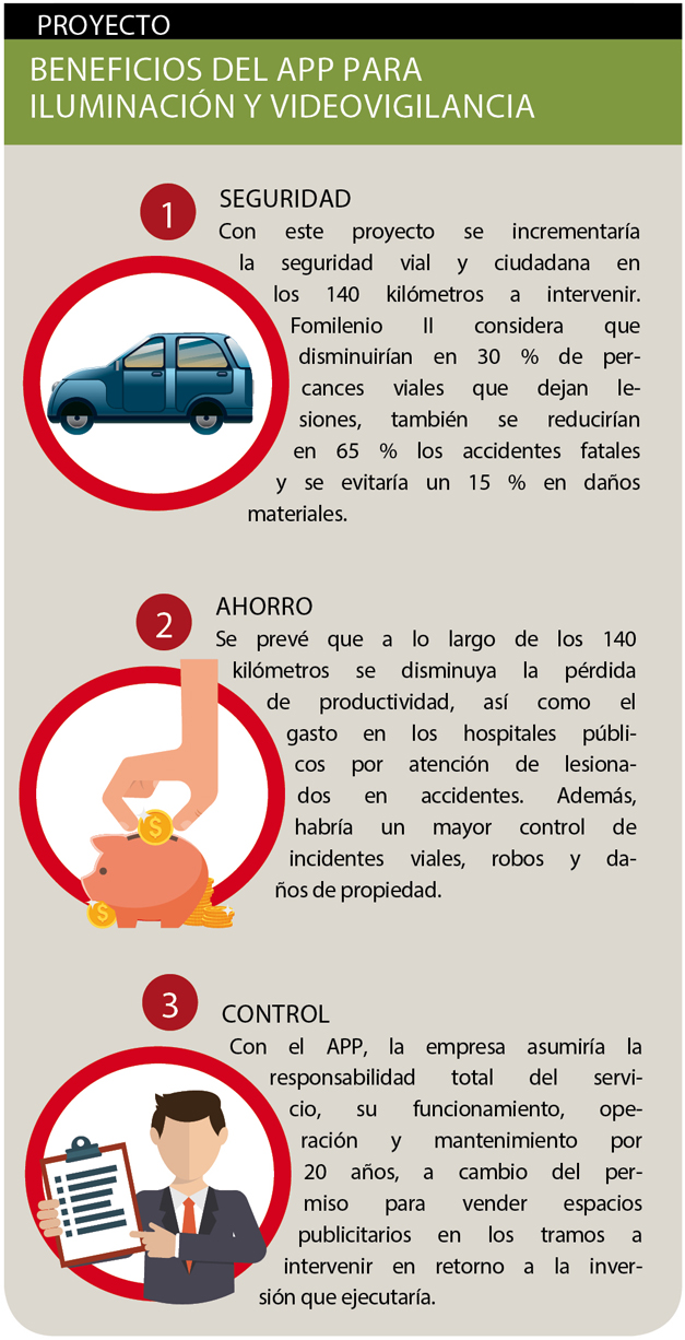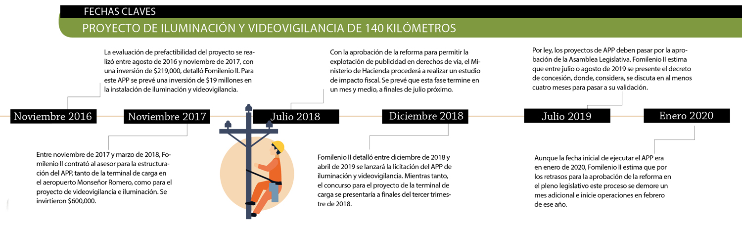 Fomilenio II señaló que el atraso en la licitación del APP para iluminación y videovigilancia se debió a la falta de aprobación en la Asamblea de la reforma al artículo 26 de la Ley de Caminos y Carreteras. Con la modificación, que se avaló el jueves, se permite a la empresa ganadora del proyecto vender espacios publicitarios en los tramos a intervenir, a cambio de colocar iluminación y vigilancia.