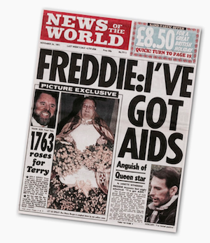 La portada del periódico News of the World destacaba el anuncio de Mercury el 23 de Noviembre de 1991.