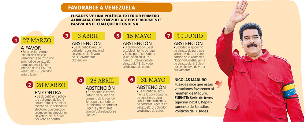 Un estudio del Departamento resume que el Gobierno de El Salvador ha apoyado en una ocasión una solicitud de Venezuela, ha votado en contra de una solicitud contra Venezuela y se ha abstenido de votar por otras resoluciones contra el gobierno del venezolano Nicolás Maduro.