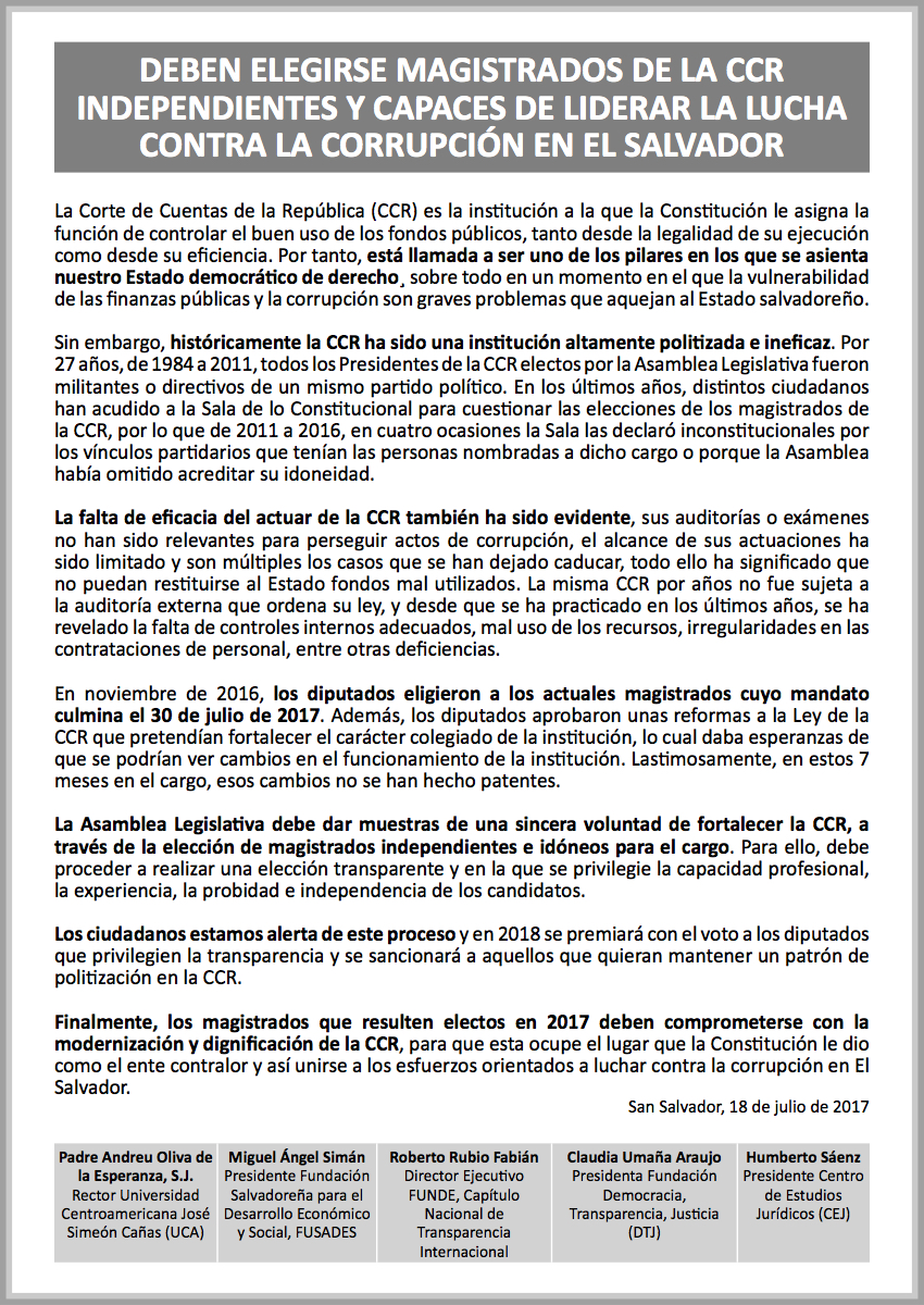 “La Asamblea Legislativa debe dar muestras de una sincera voluntad de fortalecer la CCR, a través de la elección de magistrados independientes e idóneos para el cargo. Para ello, debe proceder a realizar una elección transparente y en la que se privilegie la capacidad profesional, la experiencia, la probidad e independencia de los candidatos”, destaca Fusades, a través de un comunicado.