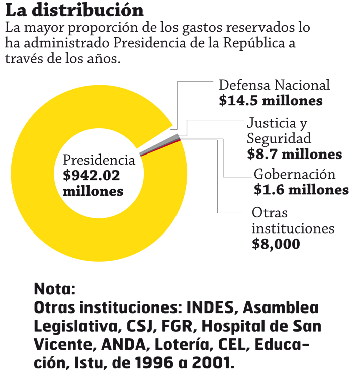 De los $966.9 millones destinados a gastos reservados en el Estado durante los 22 años analizados, $942 millones fueron fondos disponibles para la Presidencia de la República, $14.5 millones para Defensa Nacional, $8.7 millones para Justicia y Seguridad, y el resto para las demás instituciones.