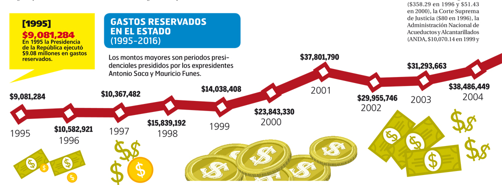 Los años con más gastos reservados en la Presidencia de la República coinciden con la presidencia de Mauricio Funes; de 2009 a 2014 se erogaron $402.7 millones. Los siguientes quinquenios de mayor erogación son 2004-2009 con $351 millones, y 1999-2004, con $170.4 millones. Estos dos últimos periodos fueron gobernados por Elías Antonio Saca y Francisco Flores, respectivamente.