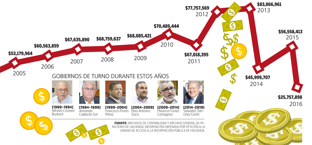 Diario El Mundo solicitó a la Unidad de Acceso a la Información Pública (UAIP) del Ministerio de Hacienda los montos anuales globales de los gastos reservados en todo el Estado desde 1988 a la actualidad. La Dirección General de Contabilidad Gubernamental (DGCG) y el Archivo General del Ministerio de Hacienda dieron cuenta de un gasto que ha oscilado entre $9 millones y $83.8 millones al año, según los reportes de ejecución que las instituciones envían a Hacienda.
