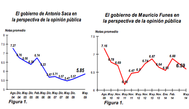 Según la misma encuestadora, los gobiernos de los expresidentes Mauricio Funes y Antonio Saca tuvieron mejores notas. La gestión de Funes inició con un 7.16 y terminó con un 6.59; y la de Saca inició con un promedio de 7.27 y terminó con un 5.85.