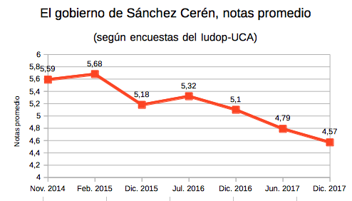 El Gobierno del presidente Salvador Sánchez Cerén llegó en 2017 a una nota de 4.57 su nota más baja desde noviembre de 2014, cuando obtuvo 5.59, de acuerdo a la encuesta del Instituto de Opinión Pública (Iudop) de la Universidad Centroamericana José Simeón Cañas (Uca).