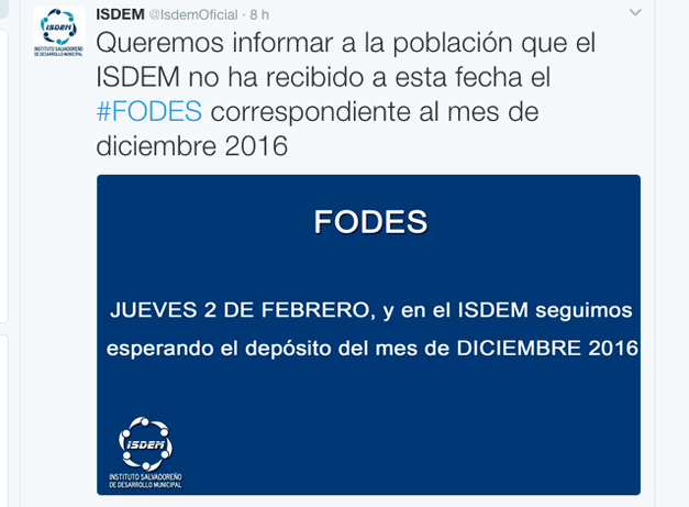 Isdem publicó en su cuenta social de Twitter que seguían esperando el depósito del Fodes.