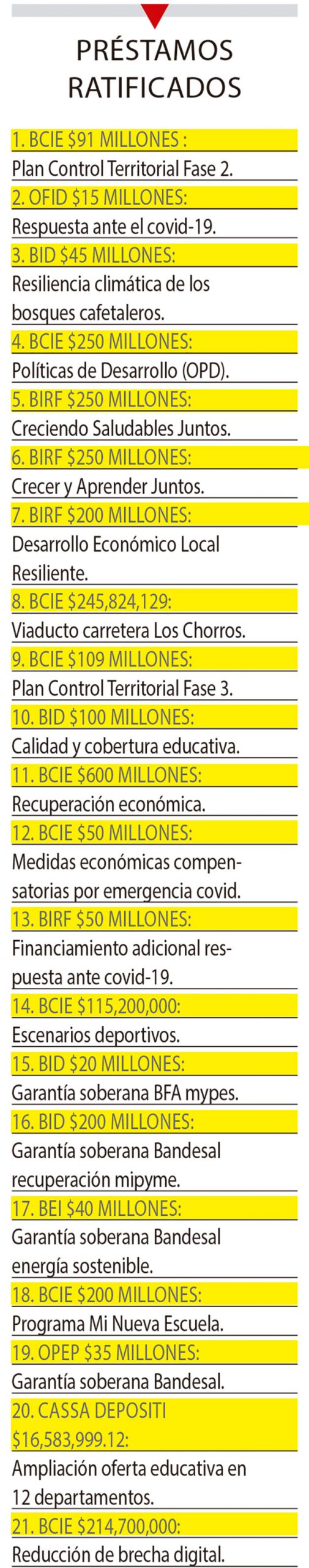 Varios de los financiamientos están destinados para programas a cargo de los ministerios de Salud, Educación, Ciencia y Tecnología; Justicia y Seguridad, y Obras Públicas y Transporte. En el año, el último préstamo ratificado ascendió a $214.7 millones para la reducción de brecha digital en centros escolares de El Salvador, con el que se repusieron fondos que utilizó el Ministerio de Educación y para cumplir con obligaciones del Estado en devolución de IVA y renta.Las garantías soberanas son respaldos que da el Estado a créditos que suscriben los bancos nacionales.