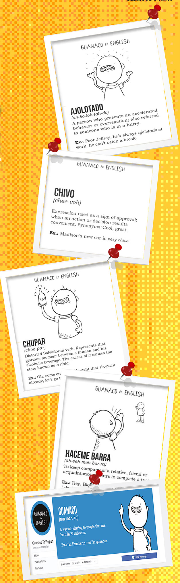 Argueta explicó a Diario El Mundo que le ha tomado unos dos años recopilar unas 200 palabras y expresiones salvadoreñas y traducirlas. Pero solo hace cinco días lanzó la cuenta Guanaco To English en Twitter e Instagram y hace tres días en Facebook.