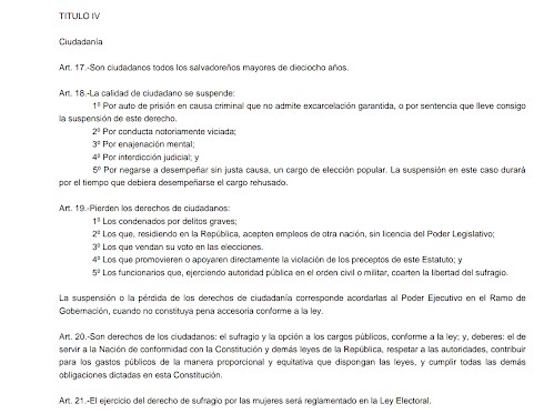 De hecho, la Constitución Política de El Salvador de 1939 reconoce que es derecho de todos los ciudadanos mayores de 18 años, ejercer el sufragio y optar a cargos públicos, sin embargo el artículo 21 de la Carta Magna de la época establece que el ejercicio de este derecho para las mujeres estar regulado en la ley electoral de ese entonces.