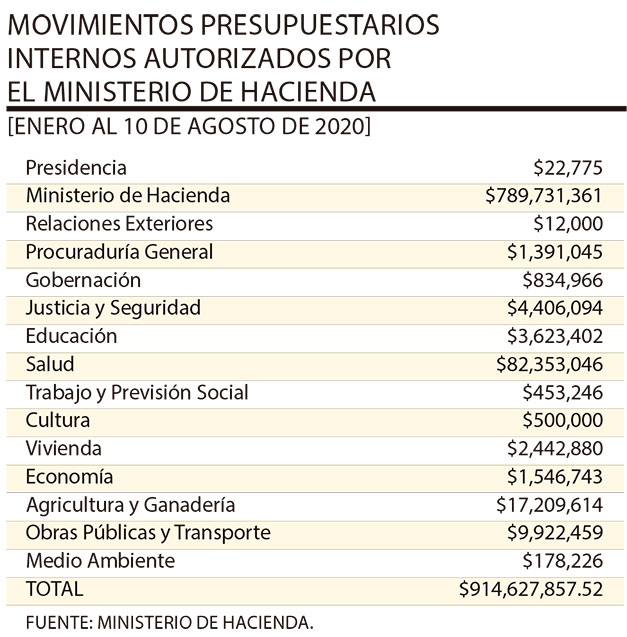 El Ministerio de Salud hizo 10 movimientos presupuestarios autorizados por Hacienda que sumaron $82.3 millones. Le sigue el Ministerio de Agricultura y Ganadería (MAG), con seis acuerdos ejecutivos que suman $17.2 millones autorizados siempre por el Ministerio de Hacienda.