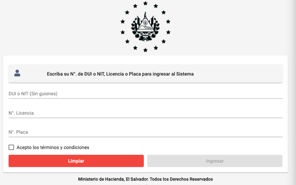 Para iniciar el proceso de devolución, los usuarios deben ingresar su número de Documento Único de Identidad (DUI) o la Tarjeta Número de Identificación tributaria (NIT) sin guiones; además de su número de licencia y el número de placa.
