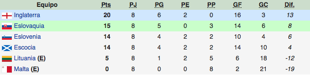 Inglaterra, con 23 puntos, aventaja en cinco a Escocia (que derrotó a Eslovaquia poe 1-0), cuando solo queda un encuentro para el final de la clasificación.
