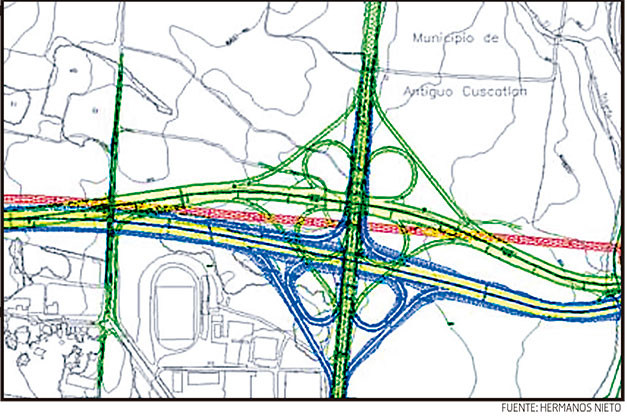En el mapa: La línea roja es la autopista diseñada en el estudio 1978-1980, con el proyecto de autopistas metropolitanas. El diseño azul es el proyecto que autorizó Hacienda en 2002 y que ratificó Medio Ambiente en 2004. El diseño verde es el que elaboró David Gutiérrez, en el 2005 y que invade el área protegida de El Espino. Los hermanos Nieto dicen que su padre regresó el proyecto al tramo azul, que fue aturoizado en 2002.