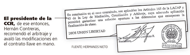 El escrito de 2007 dice que Hernán Contreras recomendó a Nieto viabilizar la obra, a través de un arbitraje. Según los hijos del exministro, Jorge y Carlos ambos de apellidos Nieto Punyed, dicen que esta carta fue excluida como prueba de parte de la Fiscalía General, en el proceso penal.