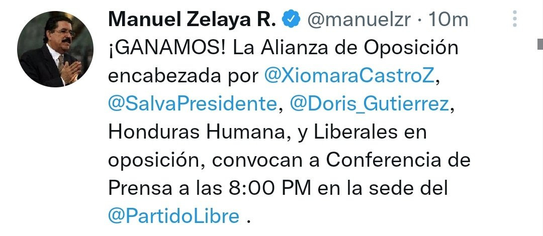 A través de Twitter, el Partido Nacional publicó una imagen con el mensaje "Ganamos" y la fotografía del candidato oficialista Asfura; mientras que el expresidente Manuel Zelaya, esposo de Xiomara Castro, la proclamó como la triunfadora de la contienda Electoral en la misma red.