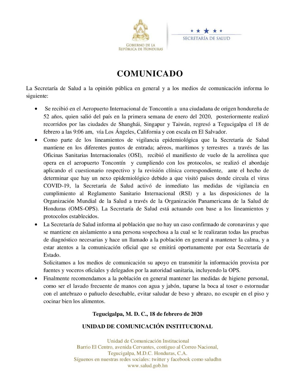 La Secretaría de Salud de Honduras indicó que su ciudadana “se mantiene en aislamiento” y que por ahora es considerada como un paciente sospechoso de coronavirus, mientras “se le realizan todas las pruebas de diagnóstico necesarias”.