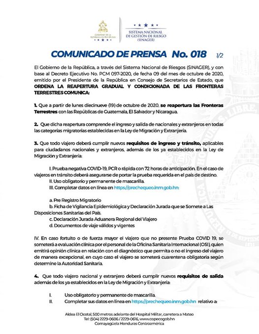 El Instituto Nacional de Migración Honduras confirmó ayer que el país abrirá nuevamente sus fronteras con El Salvador, Nicaragua y Guatemala, cerradas por la emergencia del covid-19, a partir del próximo lunes 19 de octubre.