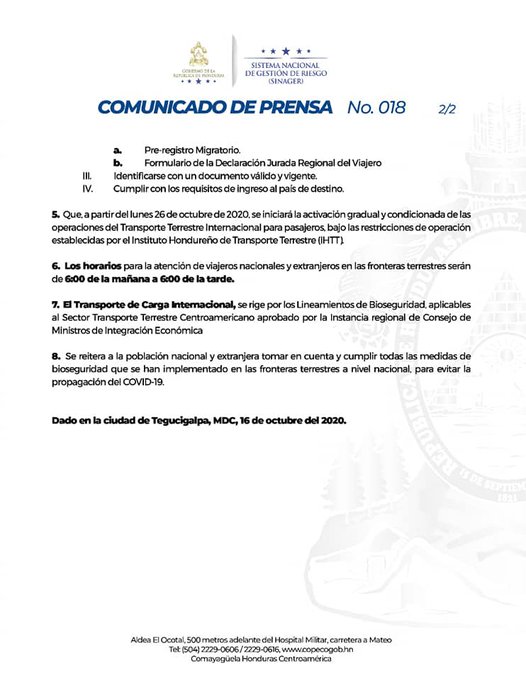 Durante la emergencia, aduanas de Honduras y el Instituto Nacional de Migración juntos han dado cumplimiento a las medidas y protocolos de bioseguridad establecidos para el Transporte de Carga Internacional, los cuales se rigen por los lineamientos de bioseguridad aplicables al sector de transporte de carga terrestre centroamericano aprobado por la instancia regional COMIECO". Juan José Vides/Director de la Administración Aduanera de HondurasSostuvo que las aduanas continúan operando y atendiendo en los horarios establecidos, bajo las medidas y protocolos de bioseguridad para evitar contagios de covid-19.