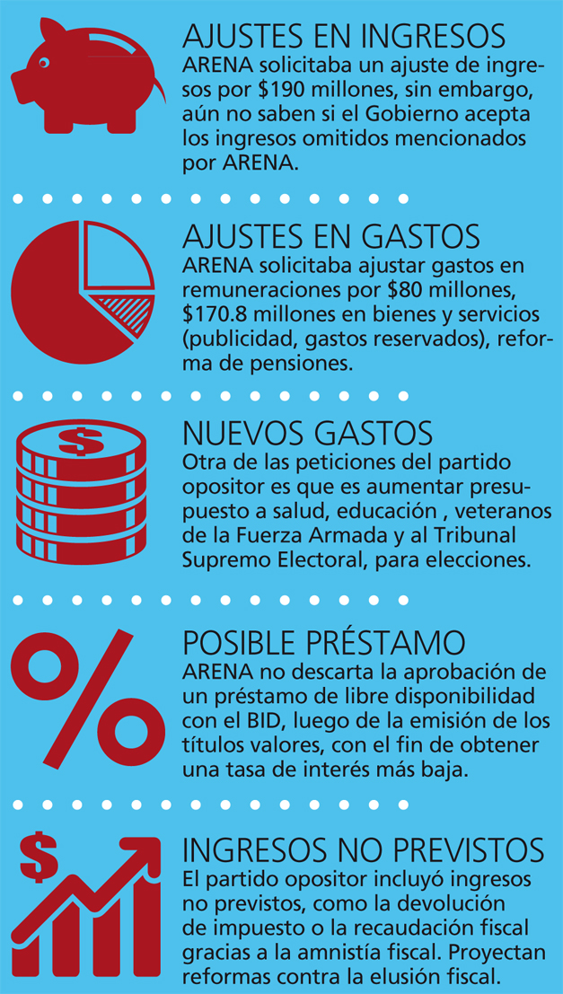 El dictamen favorable será elaborado hoy en la Asamblea Legislativa, luego de los ajustes aprobados por el Consejo de Ministros y enviados a los diputados por el Ministerio de Hacienda. Los diputados aprobarían títulos valores por esa cantidad pero también están abiertos a aprobar un presupuesto de libre disponibilidad con el Banco Interamericano para el Desarrollo (BID), con el fin de disminuir los intereses.