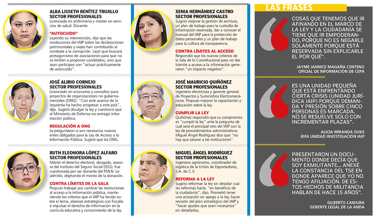 Los candidatos propusieron campañas para dar a conocer la Ley de Acceso a la Información (LAIP), gestionar más recursos, hacer alianzas, no dar un paso atrás en la lucha contra la corrupción, dispositivos tecnológicos, un edificio.