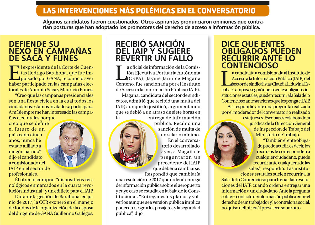 Pero también el conversatorio develó lo que piensan o proponen. Claudia Escobar, una de las candidatas, opinó que los entes obligados pueden acudir a la Sala de lo Contencioso en casos de multas o sanciones, argumentando que puede haber agravios. Los entes obligados suelen recurrir a la Sala de lo Contencioso para frenar órdenes de entrega de información pública del IAIP.