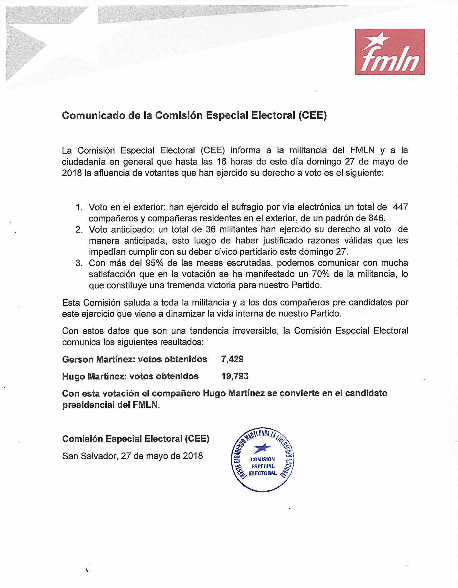 Silvia Cartagena, quien dirige la Comisión Especial Electoral dijo que Hugo Martínez ganó la elección interna con 19,793 votos frente a los 7, 429 votos de su contendiente, Gerson Martínez.