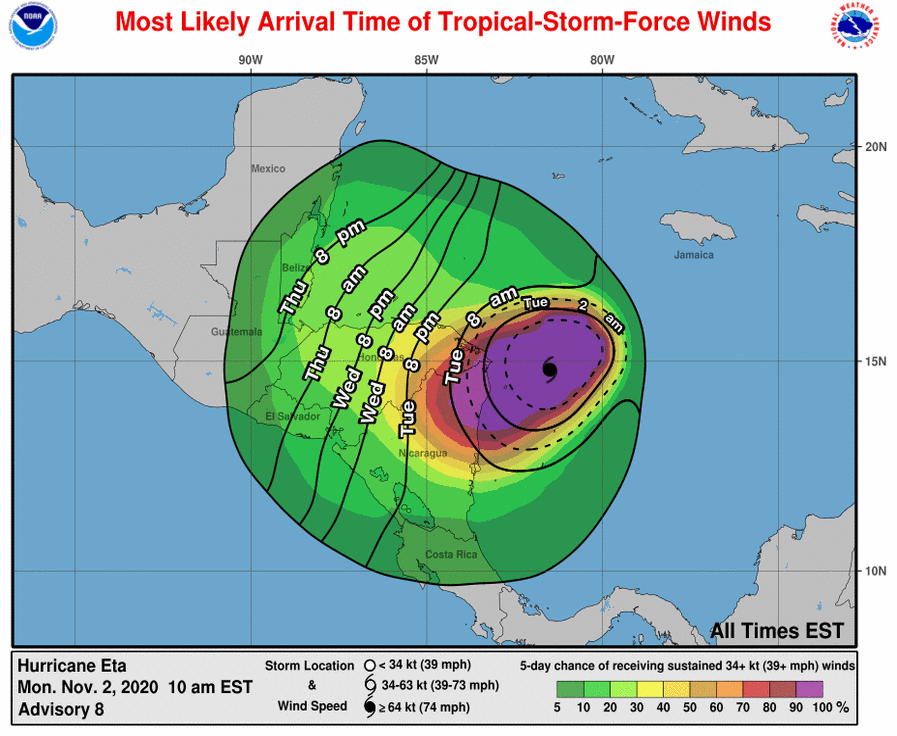 El huracán tiene vientos máximos sostenidos de 120 millas por hora. Se prevé que Eta toque tierra la madrugada del martes a unos 17 km al sur de Bilwi, principal ciudad del Caribe Norte. Una vez en tierra, Eta se atravesaría Nicaragua en dirección noreste.