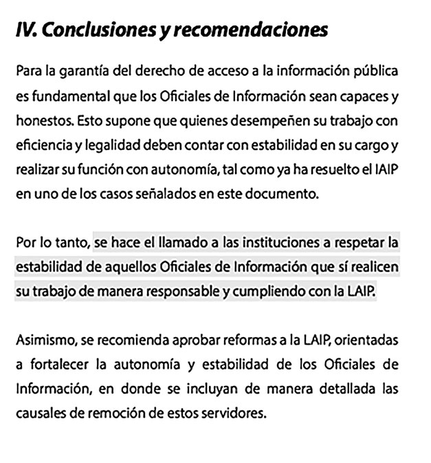 El IAIP señaló que el cargo de oficial de información de las instituciones públicas no es un cargo de confianza, que sus funciones son propias de personal de naturaleza técnica y que por ello los oficiales de información deben actuar “con total independencia” a fin de satisfacer el derecho de acceso a la información “y no a los intereses de los titulares de los entes obligados”.