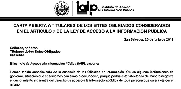Sobre oficiales de información El Instituto de Acceso a la Información Pública divulgó una carta por la mañana. Luego, Fusades pidió respetar la estabilidad laboral.