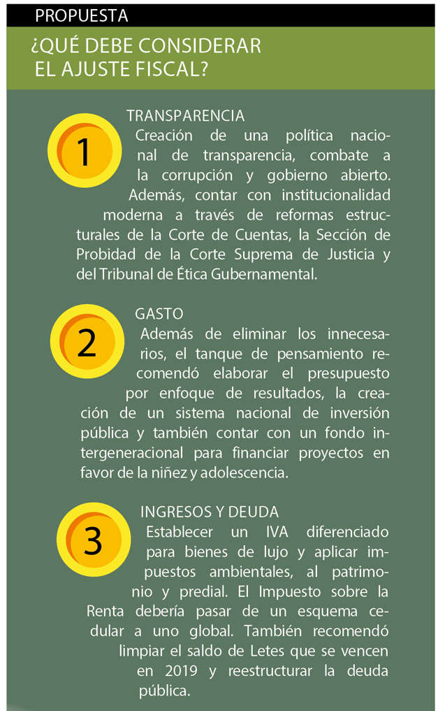 Del abanico de propuestas para el componente de gasto público, el tanque de pensamiento recomendó eliminar los egresos innecesarios en la administración pública, entre ellos los seguros privados para funcionarios, sobresueldos y la publicidad que no responda a un beneficio, explicó Ricardo Castaneda, economista sénior del Icefi en El Salvador.