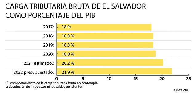 La recaudación tributaria es el principal financiamiento del presupuesto en 93.5 % del total de los ingresos previstos para 2022, “lo que denota con claridad que la única fuente real de recursos para el Estado salvadoreño son los tributos que paga la población”.